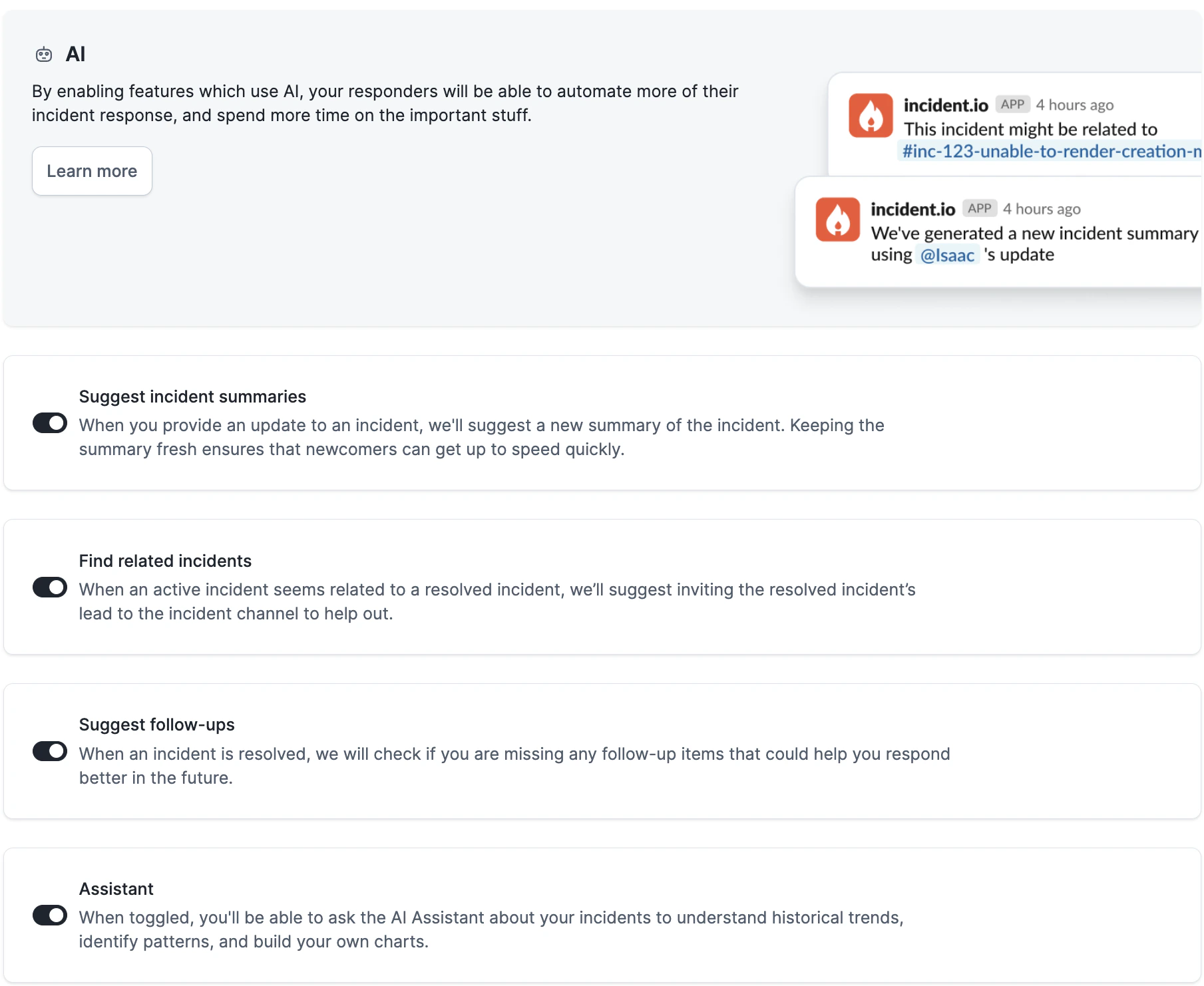 Suggested follow-ups are given when an incident is resolved. We look back through the channel and spot anywhere follow-ups were discussed. We then match these against actions and follow-ups that are already created. If we spot any that we think are missing we’ll bring them up as suggestions within the channel. You can then easily create follow-ups off the back of these suggestions.